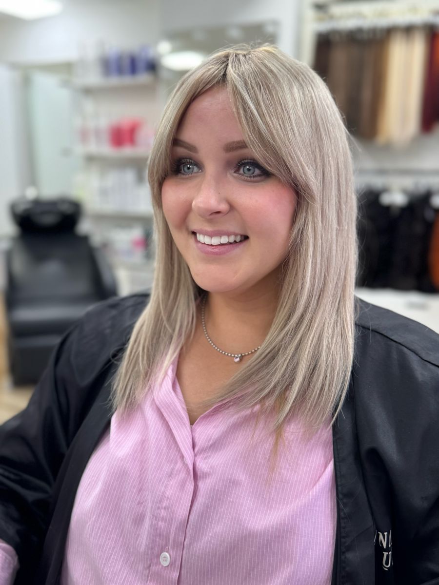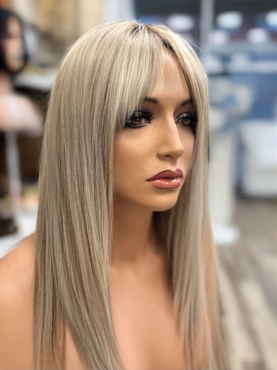 Schulterlange gestufte Lace Front Perücke in AschBlond mit dunkel Ansatz